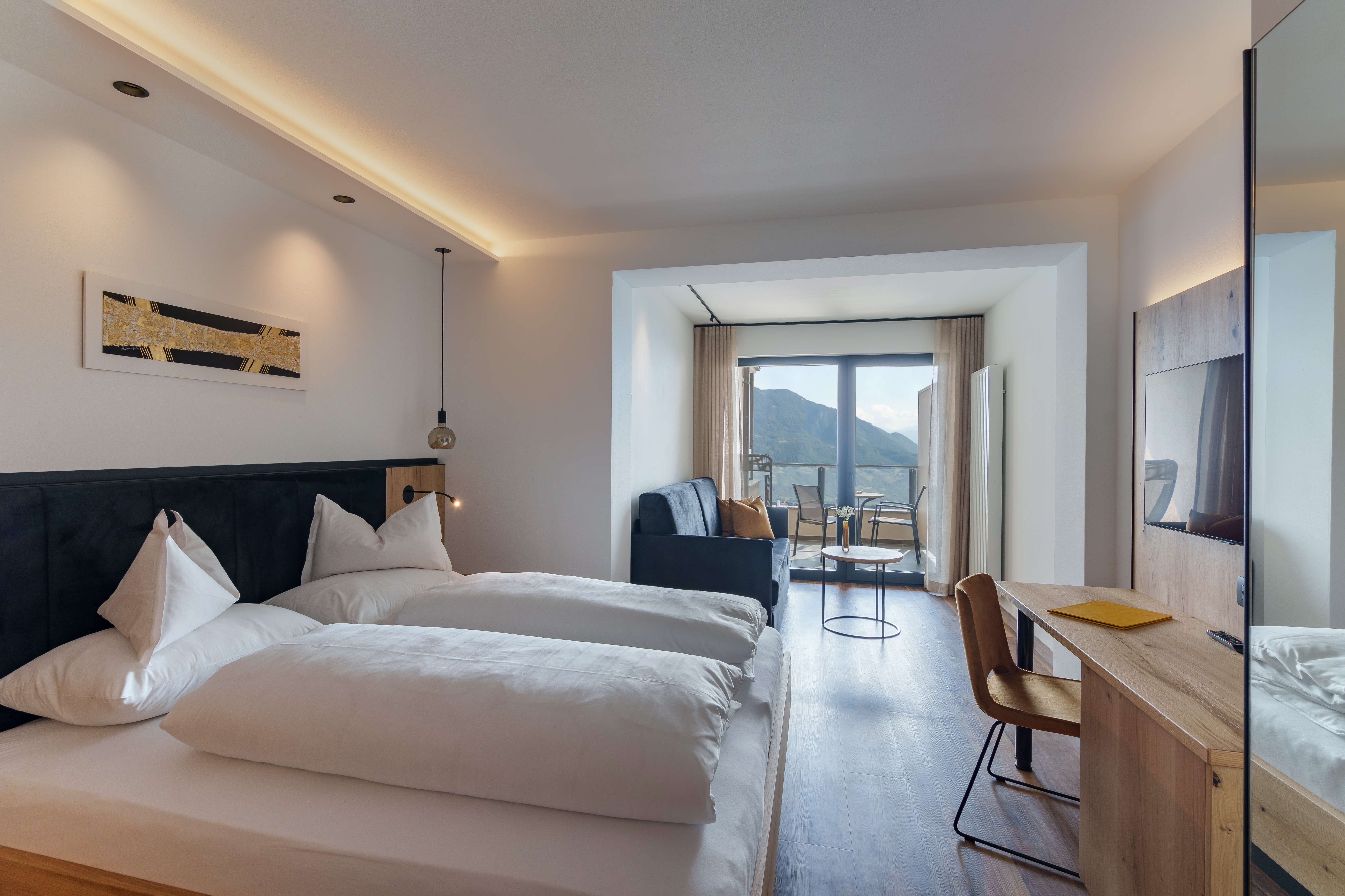 Zwei Bademäntel, Couch (Schlafcouch), Schreibtisch, Minibar, Telefon, Safe, Flat-TV, kostenloses W-LAN und Tiefgaragenstellplatz